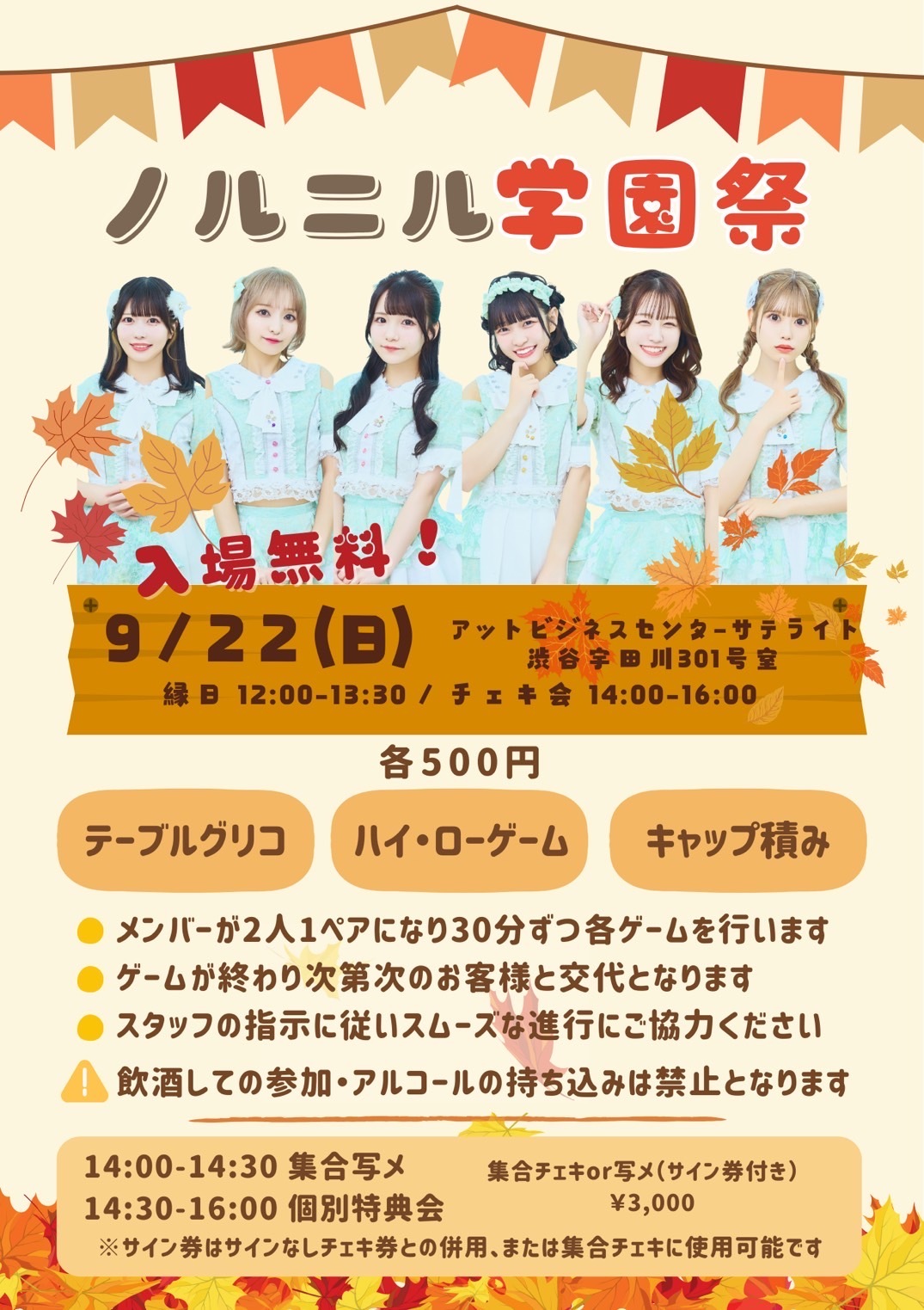 Schedule BACK TO LIST 2024.9.22[Sun] アットビジネスセンターサテライト 渋谷宇田川 301号室 『ノルニル学園祭』 \\ 入場無料 // 12:00-13:30 縁日 14:00-14:30 集合撮影 14:30-16:00 特典会 制服コスプレ 縁日の内容は画像をチェック ノルニルの学園祭に参加して特典をゲット! 2p:写メ券(お客様自身でも撮影可能) 5p:サインありチェキ券 ※通過性 ノルニルと一緒に青春謳歌しましょう! VENUE アットビジネスセンターサテライト 渋谷宇田川 301号室 東京都渋谷区 TIME 開場 / 0:00 開演 / 0:00 TICKET 前売 未定 / 当日 未定 ACT